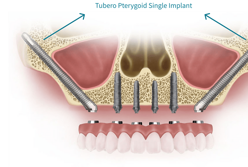 These implants are placed in the 2nd molar area of the upper jaw, known as the sphenoid bone, which is a part of the base of the skull. The dental implants are anchored to the Pterygomaxillary buttress of the upper jaw and allow immediate loading of the implants.